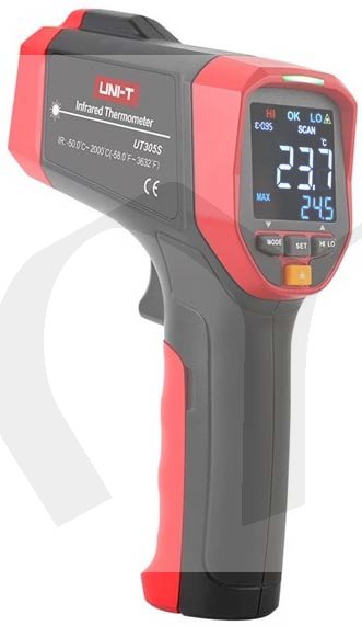Profesionální bezkontaktní infračervený teploměr UT-305S dokáže rychle a přesně určit povrchovou teplotu v rozmezí -50°C až +2000°C změřením infračervené energie vyzařované z cílového povrchu. Pro snazší a intuitivní zaměření přístroje na cílový povrch je zabudován prstencový laser, který indikuje správné zaměření teploměru. Poměr vzdálenosti k průměru měřeného povrchu je u tohoto přístroje 50 :1. Tento teploměr je odolný proti pádu z výšky 1 metru. Je možné přednastavit emisivitu měřeného povrchu v rozmezí 0,1 až 1,0. Indikaci přednastavených funkcí a naměřených hodnot zajišťuje jasný a vysoce kontrastní EBTN barevný displej a hraniční hodnoty jsou indikovány bzučákem a na displeji. Je možná indikace minimálních, maximálních a průměrných teplot a odchylek od průměru ( MIN, MAX, AVG, DIF ). Teploměr se automaticky vypíná, kvůli snížení spotřeby, pokud je bez použití po dobu 15 s v režimu HOLD a po 10 s v ostatních režimech. Doba změření teploty je v 95% případů do 250msec.