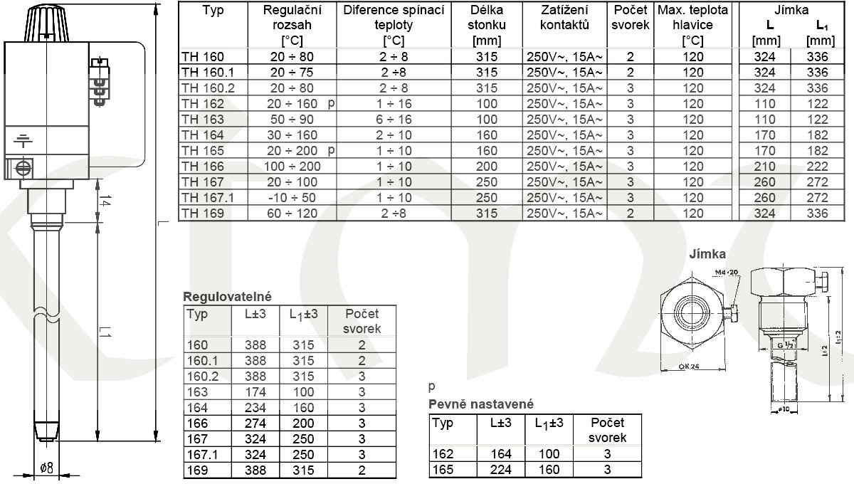 Termostaty řady TH 160 jsou tepelně závislé jednopólové spínače, založené na principu nestejné teplotní dilatace dvou různých kovů. Jsou určeny pro spínání elektrických obvodů, ale nikoliv jako hlavní spínače. Základem termostatů je spolehlivý mechanický systém, který nemá žádnou vlastní spotřebu energie. Termostaty se vyznačují vysokou odolností proti mechanickému poškození a nízkými náklady na provoz a údržbu.