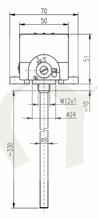 Vlastní termostat tvoří stonek a spínací hlavice. Stonek se skládá z dilatační trubky a invarové tyče. Spínací element je připevněn na výkyvném pravo­úhlém mostu, který je unášen dvěma spirálovými pru­žinami a jeho poloha proti invarové tyči se mění regu­lačním šroubem, jenž působí na jedno rameno výkyv­ného mostu. Vlastní spínací element tvoří dvě pruži­ny, kloubově spojené. Pro upevnění termostatu má základní deska dva nálitky s otvory. Při montáži je nutné, aby spodní díl spínací hlavice byl vzdálen od stěny tělesa asi 2 cm a tento prostor byl vyplněn izolační látkou tak, aby teplota spínací hlavice nepře­stoupila +120 °C.