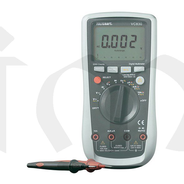 VC-830. Nová série multimetrů VOLTCRAFT®. Odolnost, spolehlivost, praktická výbava, ergonomický tvar, bezpečnost pro uživatele - to jsou atributy, jež specifikují tyto profesionální multimetry. Po stránce bezpečnosti se tento multimetr stává symbolem. Díky patentované konstrukci lze pouzdro pro výměnu baterie a pojistky otevřít pouze tehdy, když je přístroj odpojen od všech měřicích kabelů. Integrovaná funkce TLD® (Test-Lead-Detection) varuje uživatele v případě nesprávně připojených měřicích kabelů. Při vstupních napětích nad 30 V se na ukazateli objeví výstražný symbol. Multimetr má odolné pouzdro s ochranným nástřikem z měkké gumy.Jedinečnou koncepci bezpečnosti završují výkonové pojistky na 1000V se schopností odpojení proudu 30 kA a přepínaní impedance, které stisknutím tlačítka redukuje vstupní odpor kvůli zabránění chybným měřením díky rozptylovým napětím. K výbavě série patří optické rozhraní. Přístroj je schválen pro měření v kategorii přepětí CAT IV 600 V a CAT III 1000 V a zkoušen podle normy EN 61010.