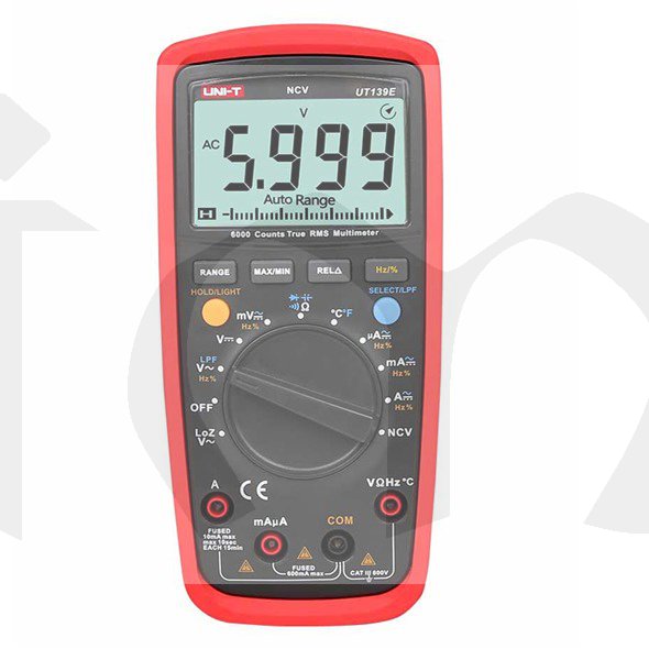 UT-139E je nový profesionální multimetr s klasifikací True RMS a ochranou CAT III 600V, navržen pro potřeby elektrikářů. Přístroj splňuje certifikaci cETLus a obsahuje řadu nadstandardních funkcí, jakými jsou např. měření napětí s nízkou impedancí (LoZ), bezkontaktní měření napětí (NCV), měření kapacity kondenzátorů, nebo také měření teploty. Přehledný displej se simulací analogového řádku s 31 segmenty zaručuje dokonalejší zobrazení naměřených hodnot a lepší vizuální reprezentaci. Rozsah měření veličin lze volit automaticky, i manuálně. Součástí balení jsou měřící kabely s hroty, termo sonda s článkem typu K a také baterie.