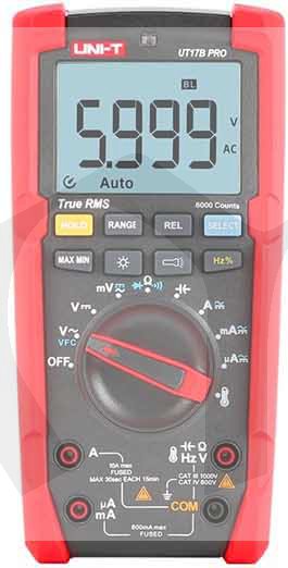 Tyto měřicí přístroje jsou dodávány s pozlacenými měřicími kabely pro rychlé a přesné měření. Multimetr UT17B PRO poskytuje ochranu v celém rozsahu do 1000 V, stejně jako ochranu proti přepěťovým špičkám napětí 8 kV, aby mohl odolat náhlým rázům vysokého napětí. Rozsahy mohou být přepínané automaticky nebo manuálně. Můžete využít automatického podsvícení displeje LCD, jehož maximální zobrazitelná hodnota je 6200. Měřicí přístroj UT17B PRO umožňuje také měření kmitočtu, pracovního cyklu a teploty. Možnost používání i v prostředí s elektrickým polem až 1V/m. Proudový rozsah μA a mA je jištěn rychlou pojistkou FF440 mA H 1000 V, ø10 x 38mm CE a proudový rozsah 10A je jištěn rychlou pojistkou FF11A / 1000V ø10 x 38mm CE. Napájení je provedeno dvěma kusy tužkových baterií AA R6 1,5V a přístroj se automaticky vypíná po 15ti minutách nečinnosti (funkci lze dočasně vypnout).