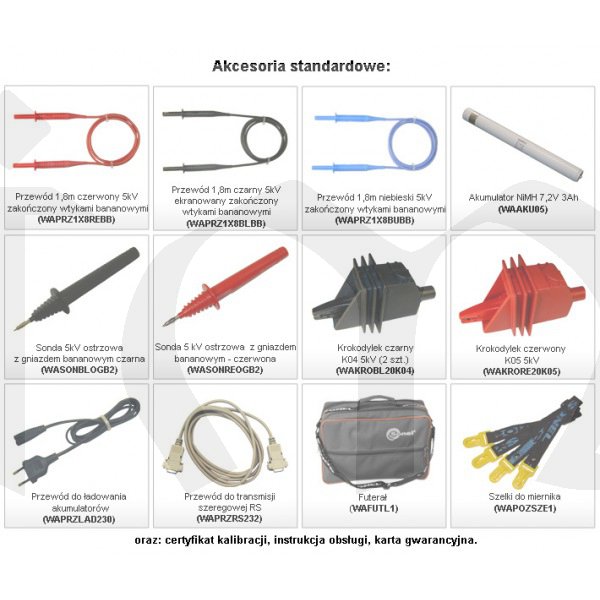 Testovací napětí volitelné v rozsahu 250 .. 5000 V s krokem 50 V. Měřicí rozsah izolačního odporu 250 kohm až 5 Tohm. Měření svodového proudu izolace. Měření AC/DC napětí v rozsahu 0..600 V. Indikace unikajícího proudu. Uložení až 999 výsledků měření. Nastavení měřícího intervalu 1..600 s. Rozhraní RS 232.