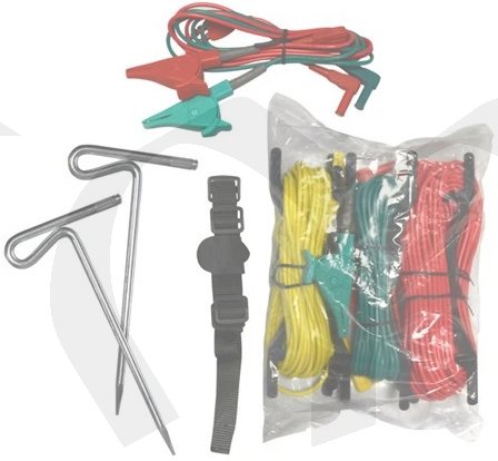 V příslušenství jsou kabely pro standardní třívodičové měření (zelený délky 5m, žlutý délky 10m, červený délky 20m), jednoduché testovací kabely pro dvouvodičové měření, 2ks pomocných zemnicích elektrod.