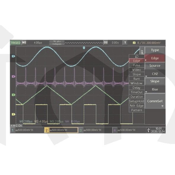 Vestavěný dvoukanálový generátor signálu 50MHz vln s průběhem sinus, čtverec, sklon, puls, šum, DC a libovolná vlna. Umožňuje modulování signálů AM a FM modulací z interního zdroje a matematické operace se signály.