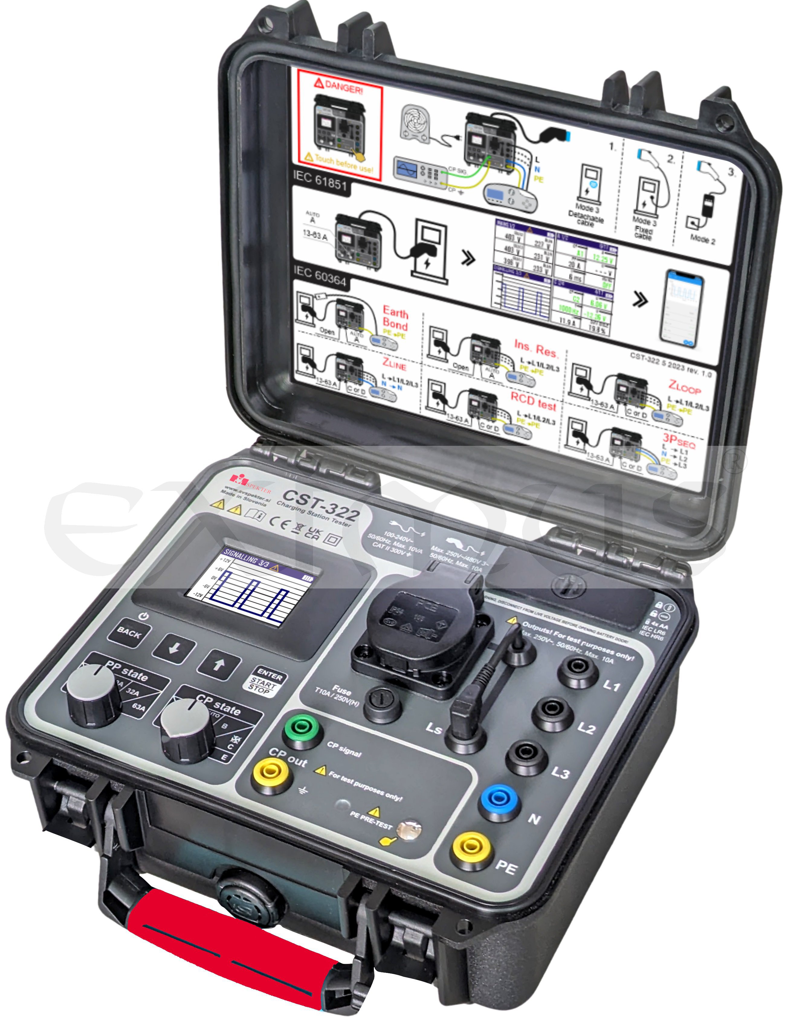 Přístroj je osazen LCD displejem a nezávislým procesorum umožňujícím funkci AUTOTEST. Ta zjednodušuje analýzu a zkracuje čas strávený testováním. Analyzátor nabíjecích stanic pro elektromobily CST-322 je navržen v souladu s normami IEC/EN 61851-1 a IEC/HD 60364-7-72.