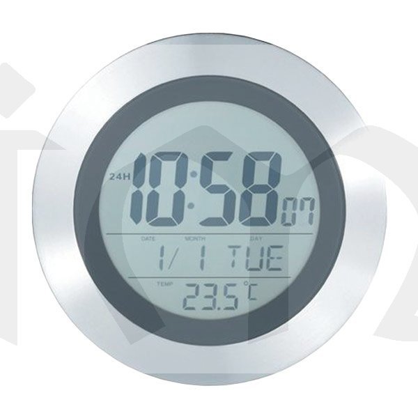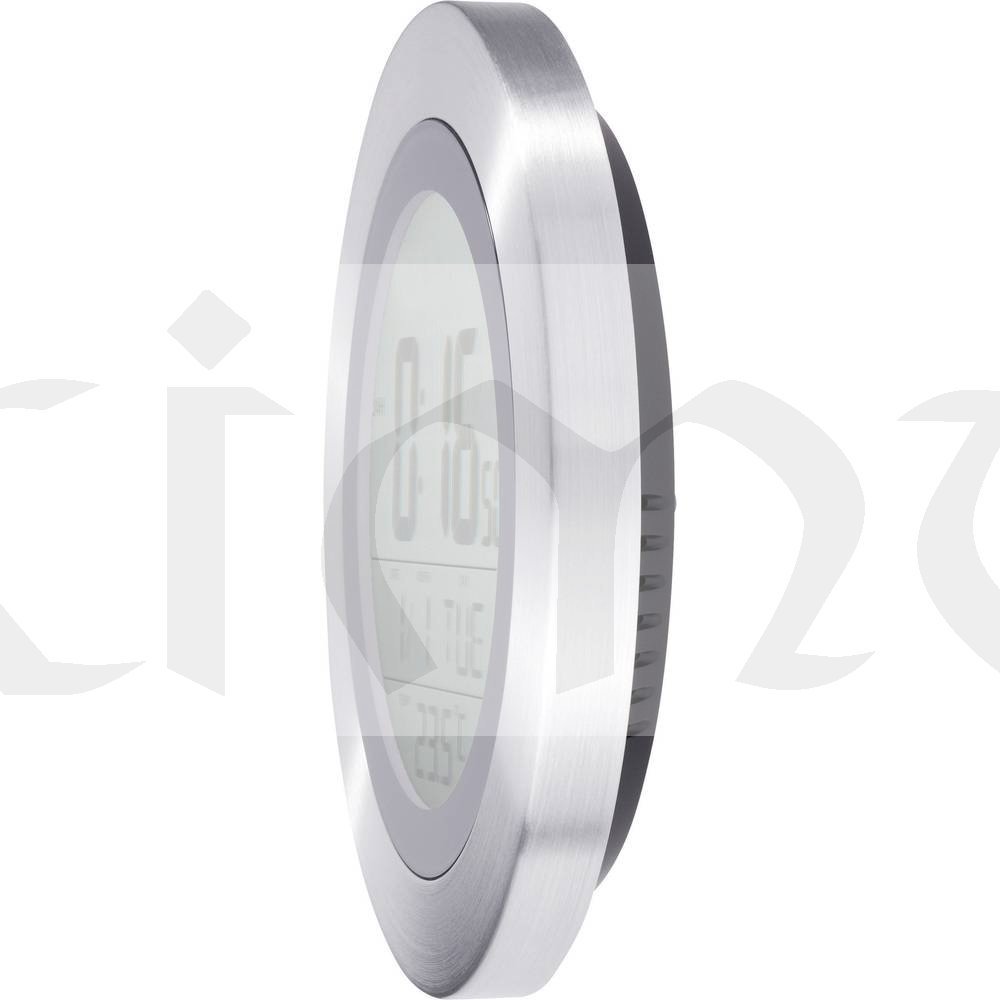 Díky svému ušlechtilému hliníkovému rámu upoutávají tyto nástěnné hodiny pozornost. Čas, datum s dny v týdnu a teplota jsou zobrazeny na velkém LCD displeji na první pohled.