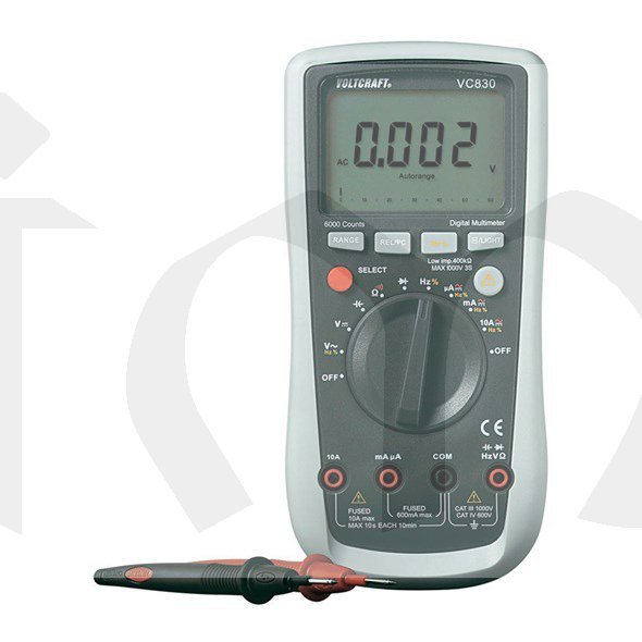 VC-830. Nová série multimetrů VOLTCRAFT®. Odolnost, spolehlivost, praktická výbava, ergonomický tvar, bezpečnost pro uživatele - to jsou atributy, jež specifikují tyto profesionální multimetry. Po stránce bezpečnosti se tento multimetr stává symbolem. Díky patentované konstrukci lze pouzdro pro výměnu baterie a pojistky otevřít pouze tehdy, když je přístroj odpojen od všech měřicích kabelů. Integrovaná funkce TLD® (Test-Lead-Detection) varuje uživatele v případě nesprávně připojených měřicích kabelů. Při vstupních napětích nad 30 V se na ukazateli objeví výstražný symbol. Multimetr má odolné pouzdro s ochranným nástřikem z měkké gumy.Jedinečnou koncepci bezpečnosti završují výkonové pojistky na 1000V se schopností odpojení proudu 30 kA a přepínaní impedance, které stisknutím tlačítka redukuje vstupní odpor kvůli zabránění chybným měřením díky rozptylovým napětím. K výbavě série patří optické rozhraní. Přístroj je schválen pro měření v kategorii přepětí CAT IV 600 V a CAT III 1000 V a zkoušen podle normy EN 61010.