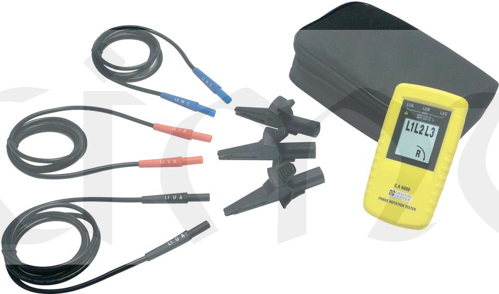 Zkušební přístroj C.A 6608 pro automatickou kontrolu sledu fází a směru točivého pole vnějšího vodiče v průmyslových elektroinstalacích.