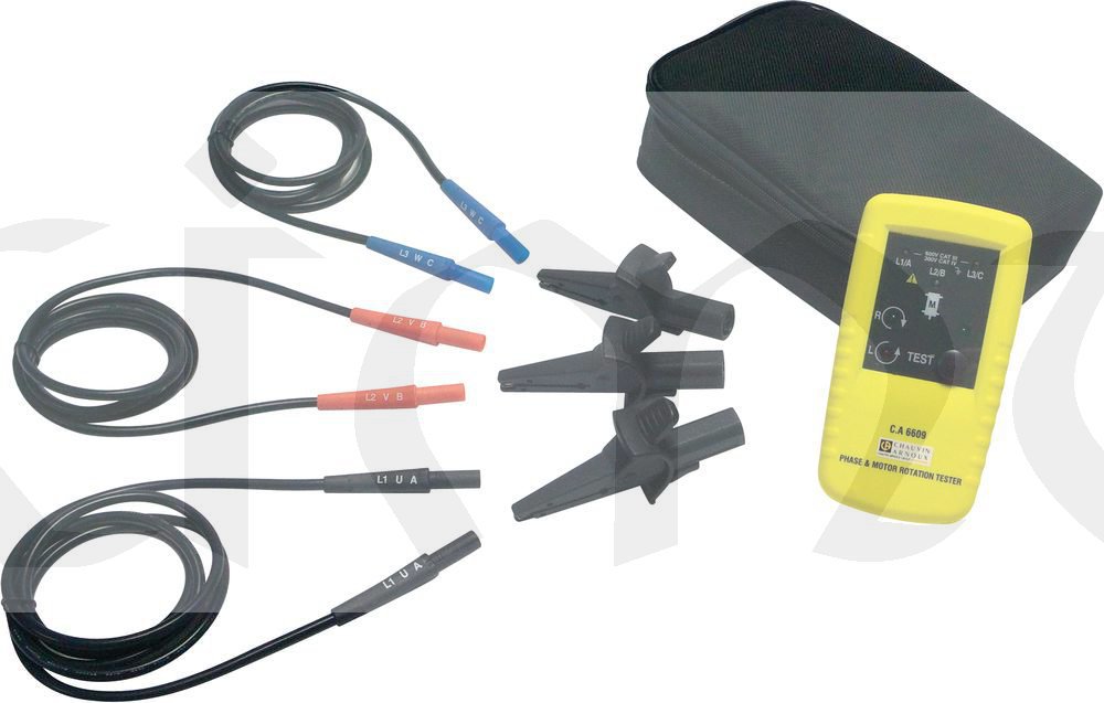 Automatický tester C.A 6609 kontroluje sled fáze vnějšího vodiče a směr otáčení pohonu v průmyslových elektroinstalacích. Kontrola motoru pomocí jednoho tlačítka.