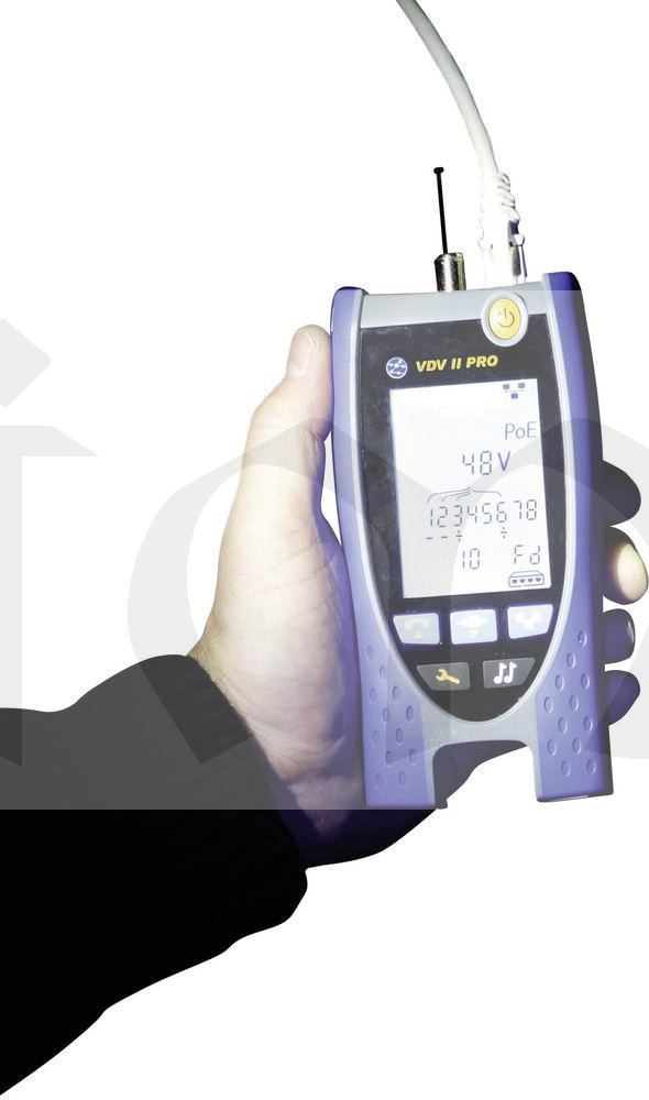 VDV II Pro se snadno ovládá a umožňuje rychlou kontrolu měděných kabelů od hlasových, datových a video instalací, jako jsou telefonní linky, datové kabely bezpečnostní a video sítě, a to jak v domácnosti, tak v kanceláři a průmyslové prostředí. Prémiový model mezi testery kabelů ukazuje chyby ve vedení jako je přerušení, zkrat, špatné zapojení a prohozené páry, zatímco reflektometr TDR podporuje vyhledávání poškození. Rozpozná analogové (PBX) a digitální (ISDN) telefonní služby a ukazuje rychlost přensu dat v síti a duplex statusu. K dispozici je připojení pro konektory RJ11, RJ45, koax F a BNC. Zkoušečka je vybavena velkým podsvíceným LCD displejem a integrovaným remote adaptérem na spodní straně přístroje.
